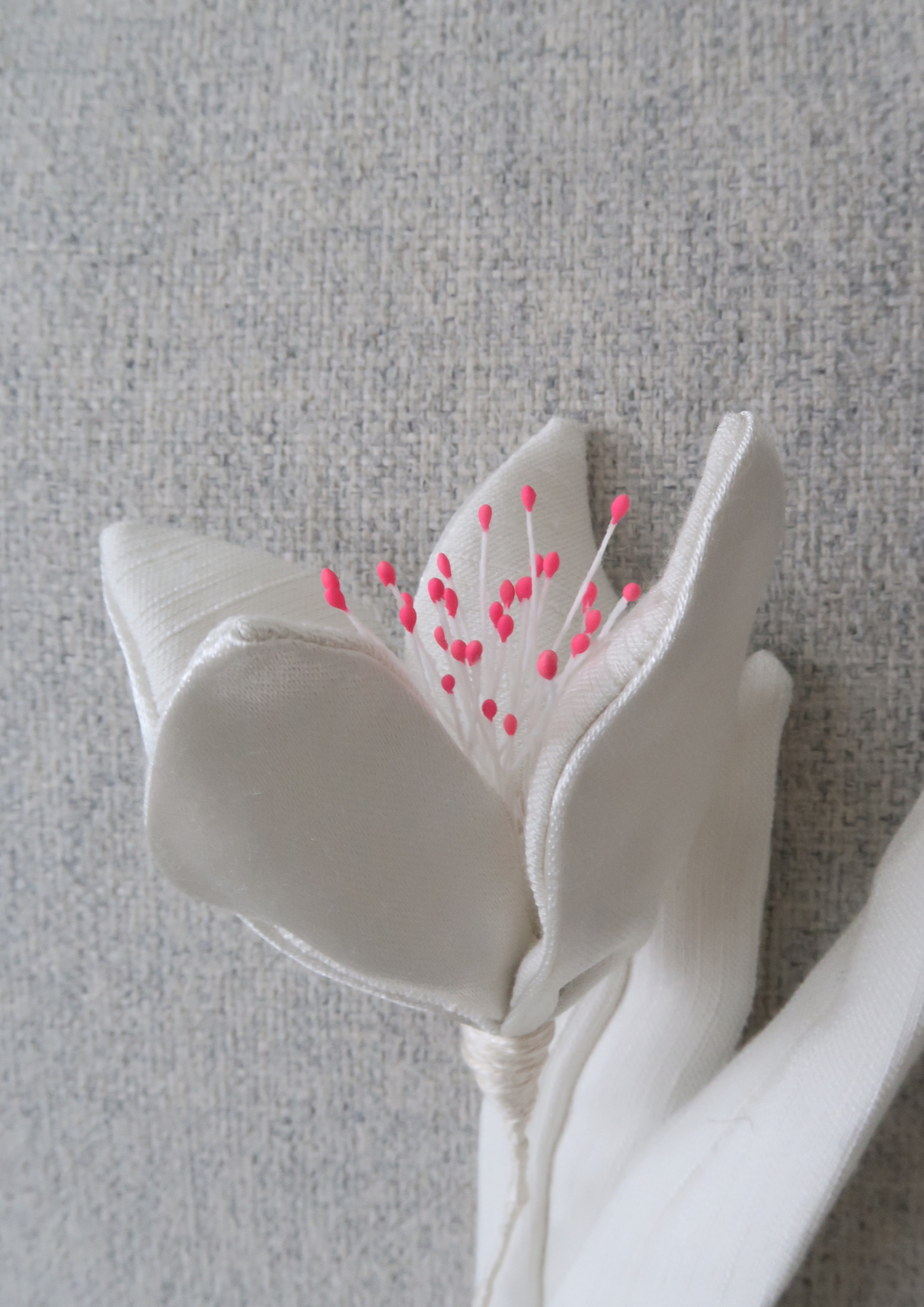 Fleur réalisée dans du linge ancien, contient de la soie. Ce modèle est UNIQUE.